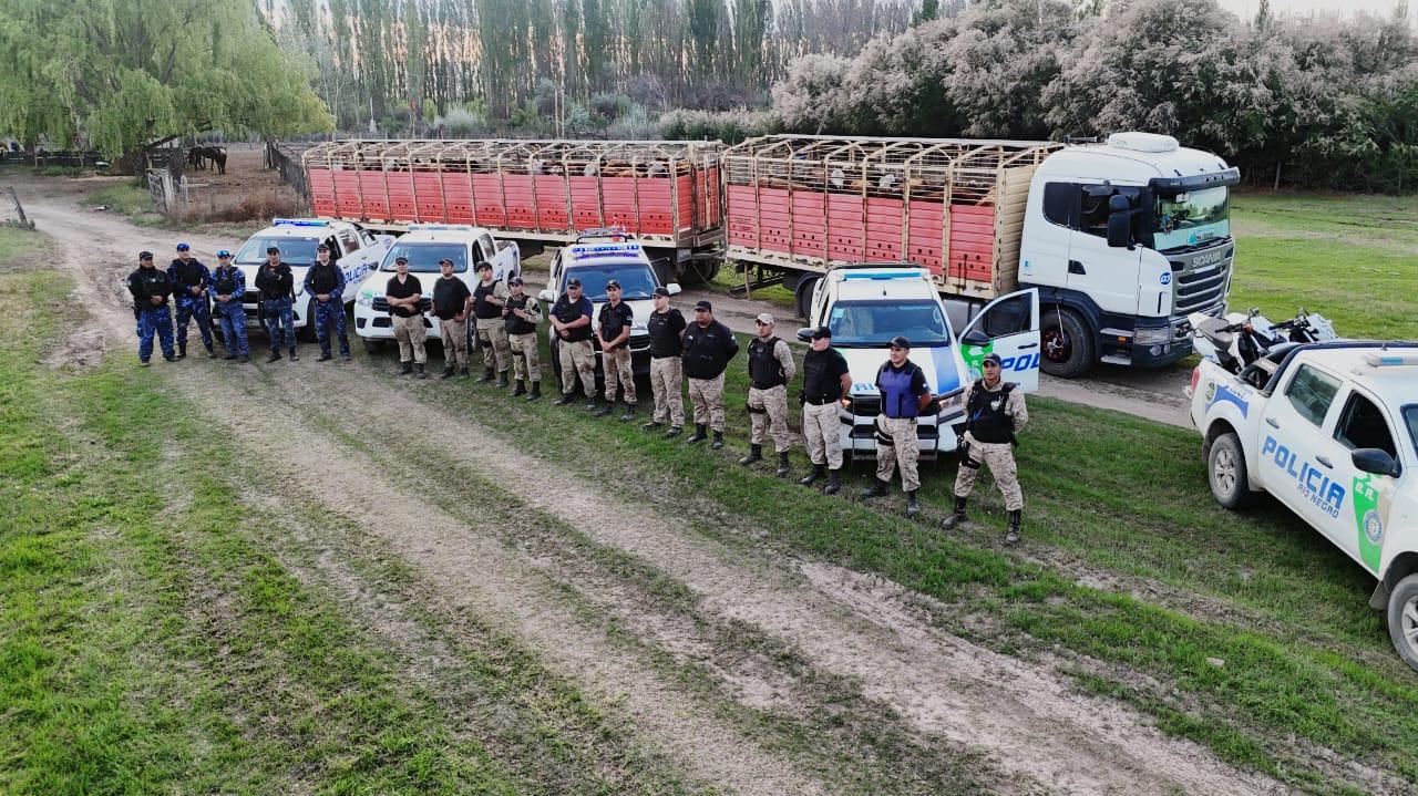 Durante un operativo desplegado en zona rural de Chimpay, la Policía de Río Negro logró avanzar en la investigación por el ataque con armas que sufrieron días atrás efectivos de la Brigada Rural, y además descubrió dentro del mismo establecimiento desde donde provinieron los disparos un rodeo de 52 animales vacunos sin marcas ni registros que fue secuestrado.