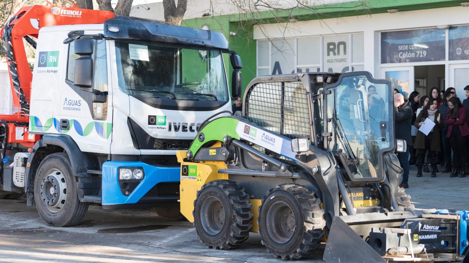 El Gobernador Alberto Weretilneck entregó esta mañana en Viedma nuevos vehículos y maquinaria pesada para Aguas Rionegrinas, con el objetivo de optimizar sus tareas operativas en toda la provincia. La inversión total de más de $1.376 millones, financiada con fondos propios, permitió la adquisición de 6 camionetas, 1 camión hidrogrúa, 1 camión desobstructor combinado, 1 miniexcavadora, 2 retroexcavadoras y 2 minicargadoras.